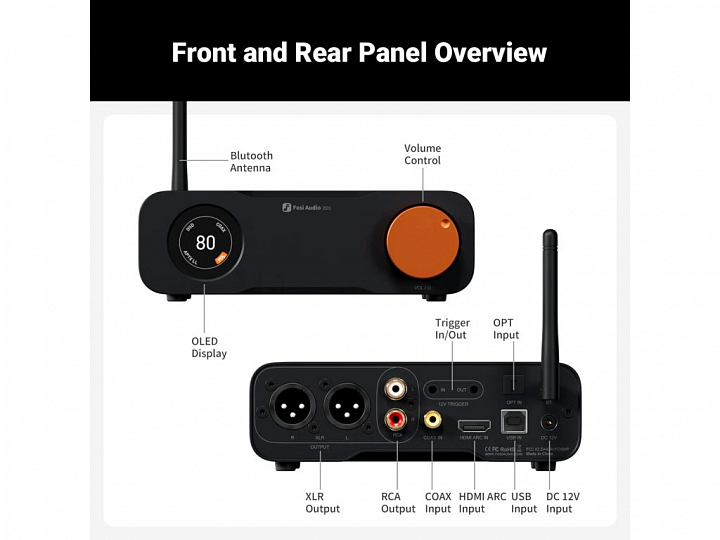 Plně symetrický desktopový DAC s podporou 32bit/768 kHz a DSD512. XLR/RCA výstupy, HDMI ARC a Bluetooth.