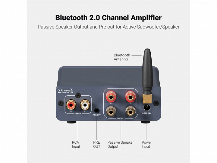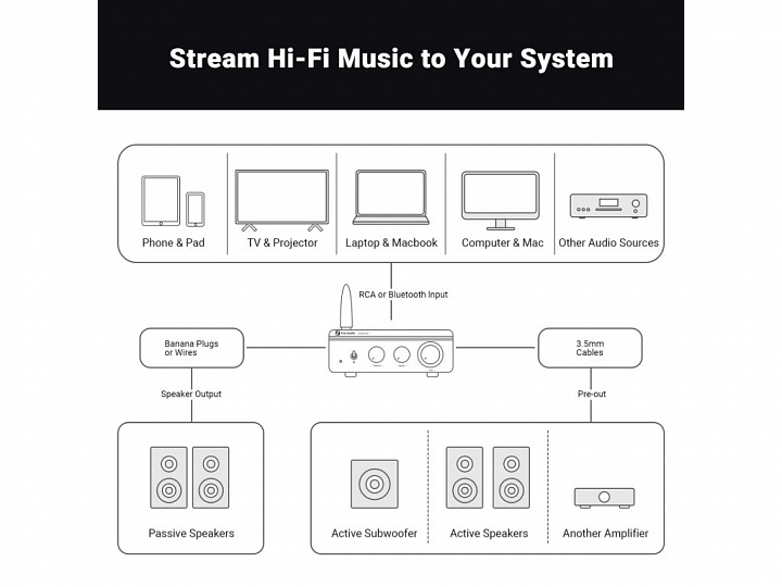Bluetooth umožňuje pohodlné streamování hudby z chytrého telefonu, tabletu nebo notebooku. Kromě bezdrátového připojení je k dispozici také linkový vstup pro propojení s televizí, DACem, gramofonovým předzesilovačem nebo jiným audio zdrojem.
