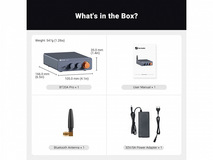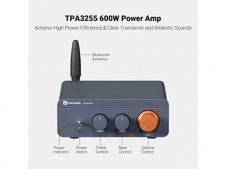 Základem BT20A Pro je účinný výkonový stupeň, který poskytuje dostatek energie pro většinu pasivních reproduktorů. Zvuk je čistý, dynamický a dobře kontrolovaný, s pevnými basy a detailními středy. Díky moderní technologii třídy D zůstává zesilovač energeticky efektivní a produkuje minimum tepla.