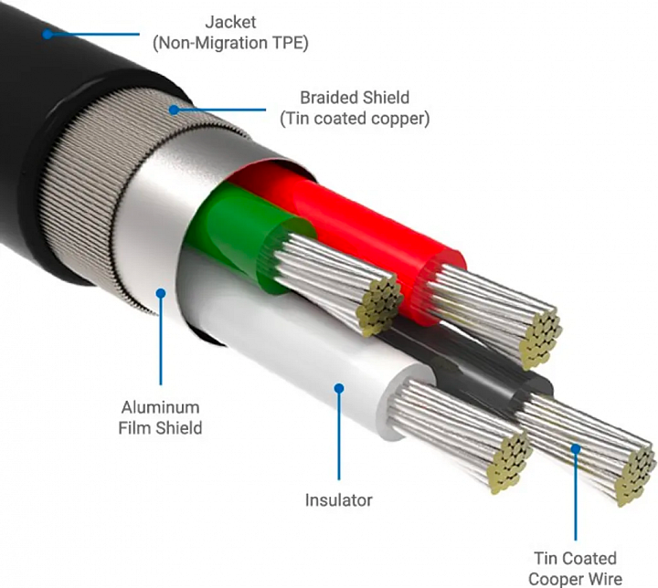 Samotný propojovací kabel disponuje duálním stíněním; vnitřní vodiče z pocínované mědi jsou chráněny dodatečným měděným opletem, který blokuje elektromagnetické i vysokofrekvenční interference.